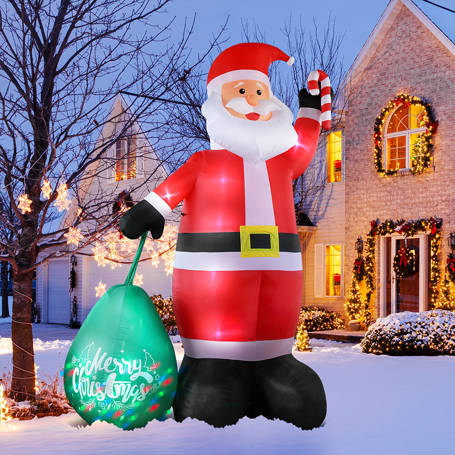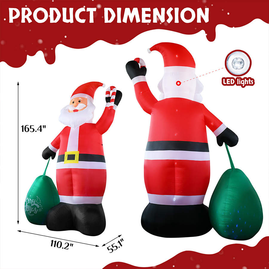 Giant 14FT Design: This extra-large inflatable Santa Claus stands 14 feet tall, holding a festive gift bag and waving a candy cane—perfect for creating an eye-catching holiday display.