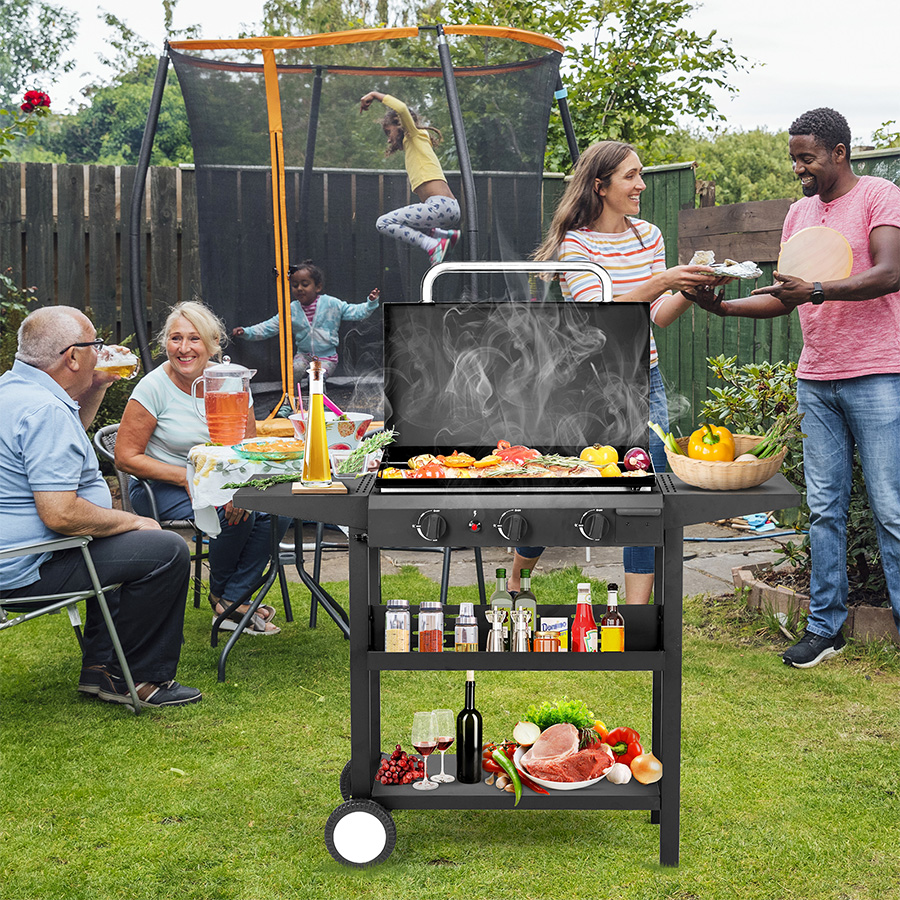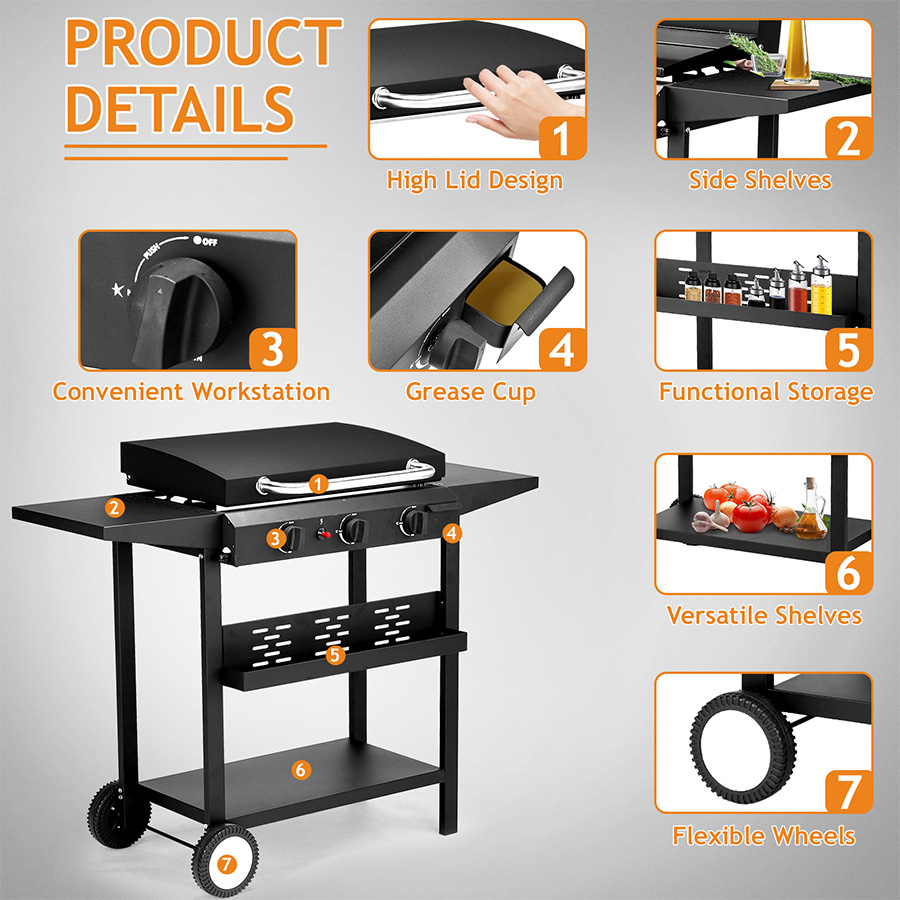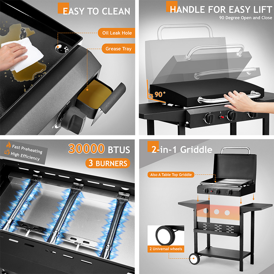 1. 3-Burner Gas Flat Top Griddle delivers up to 30,000 BTU for fast, even outdoor cooking