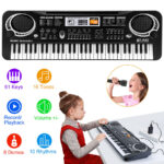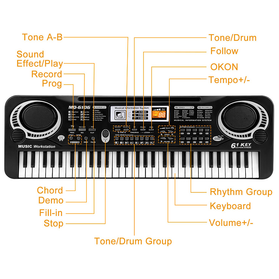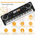 Introduce your child to the joy of music with this 61-key digital music electronic keyboard. Designed for beginners, kids, and music enthusiasts, this multifunctional piano offers 16 tones, 10 rhythms, 8 percussion sounds, and 6 English demo songs, making learning both fun and engaging.