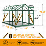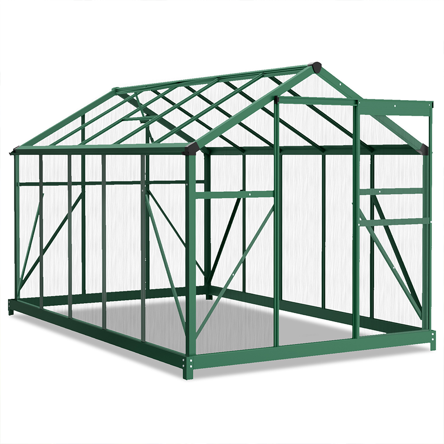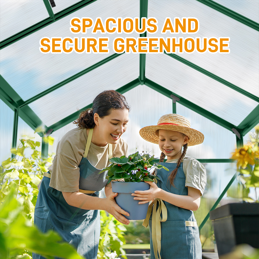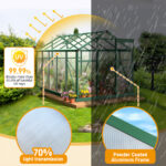 Built with durable 4mm polycarbonate panels, this outdoor polycarbonate greenhouse allows up to 70% light transmission while blocking over 99.9% of harmful UV rays, helping plants stay warm and protected from frost. The heavy-duty aluminum alloy frame features a reinforced triangular internal structure, providing excellent stability in wind, rain, and changing outdoor conditions.