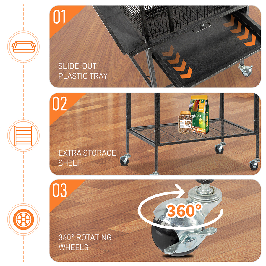 The rolling stand with four smooth casters makes moving the cage effortless, whether you’re rearranging your living room or letting your birds enjoy a sunny spot near the window.