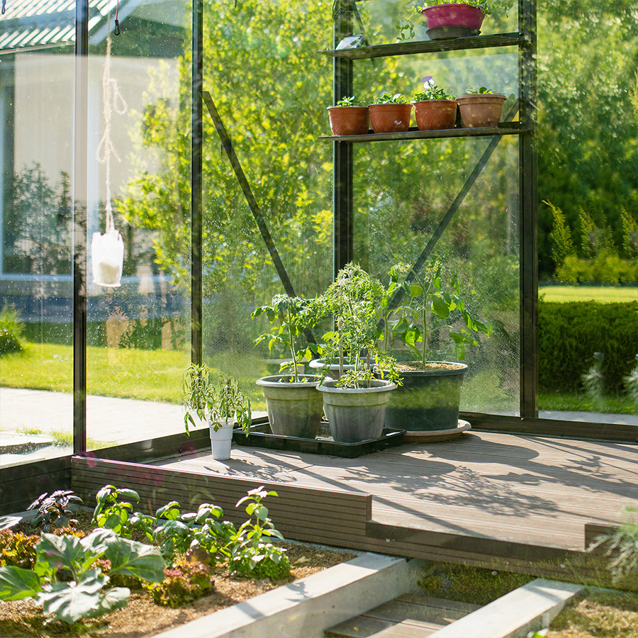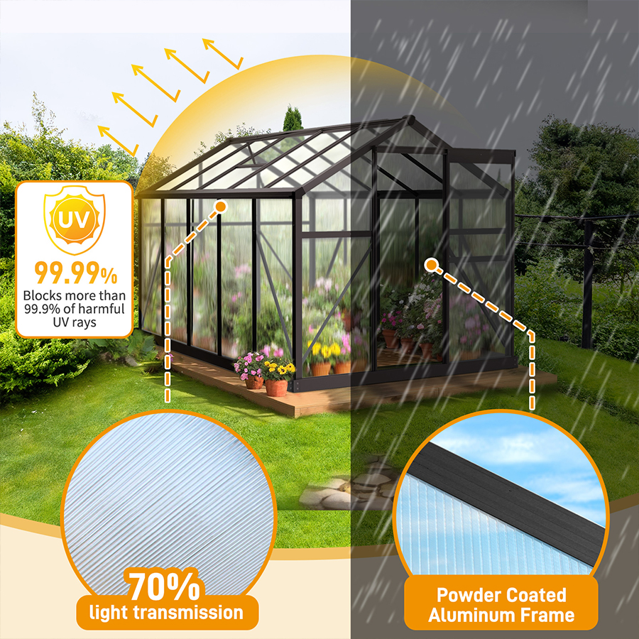 This hybrid greenhouse features a smart panel combination: twin-wall translucent polycarbonate roof panels paired with crystal-clear shatterproof PC wall panels. This design allows up to 70% light transmission, ensuring plants receive enough sunlight for strong growth while effectively blocking over 99.9% of harmful UV rays. The result is a well-lit interior that reduces the risk of plant sunburn while maintaining warmth and frost protection, making it suitable for year-round outdoor greenhouse use.