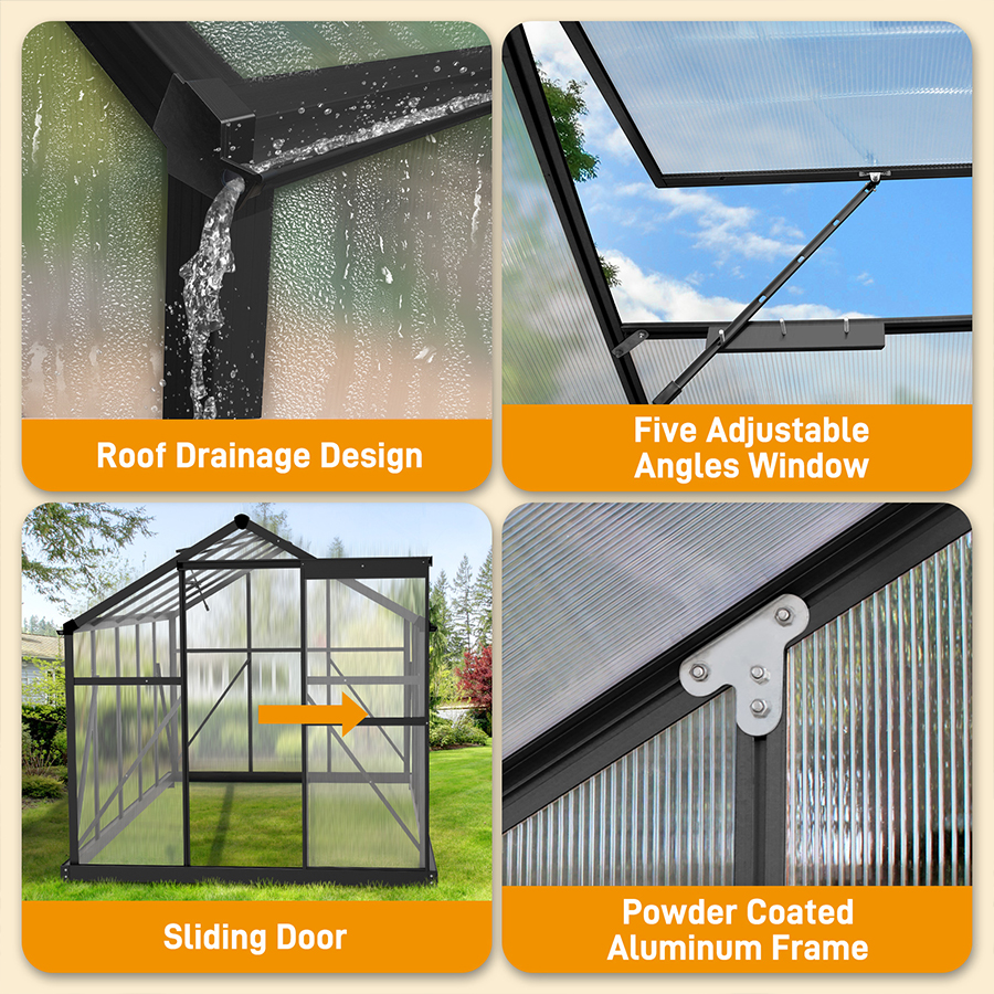 The structure is supported by a heavy-duty aluminum alloy frame with a 1mm thickness, offering excellent strength without excessive weight. The rust-resistant and moisture-proof aluminum ensures long-term durability in outdoor environments. An internally closed triangular support structure enhances overall stability, helping the greenhouse withstand wind, rain, and other harsh weather conditions without loosening or collapsing.
