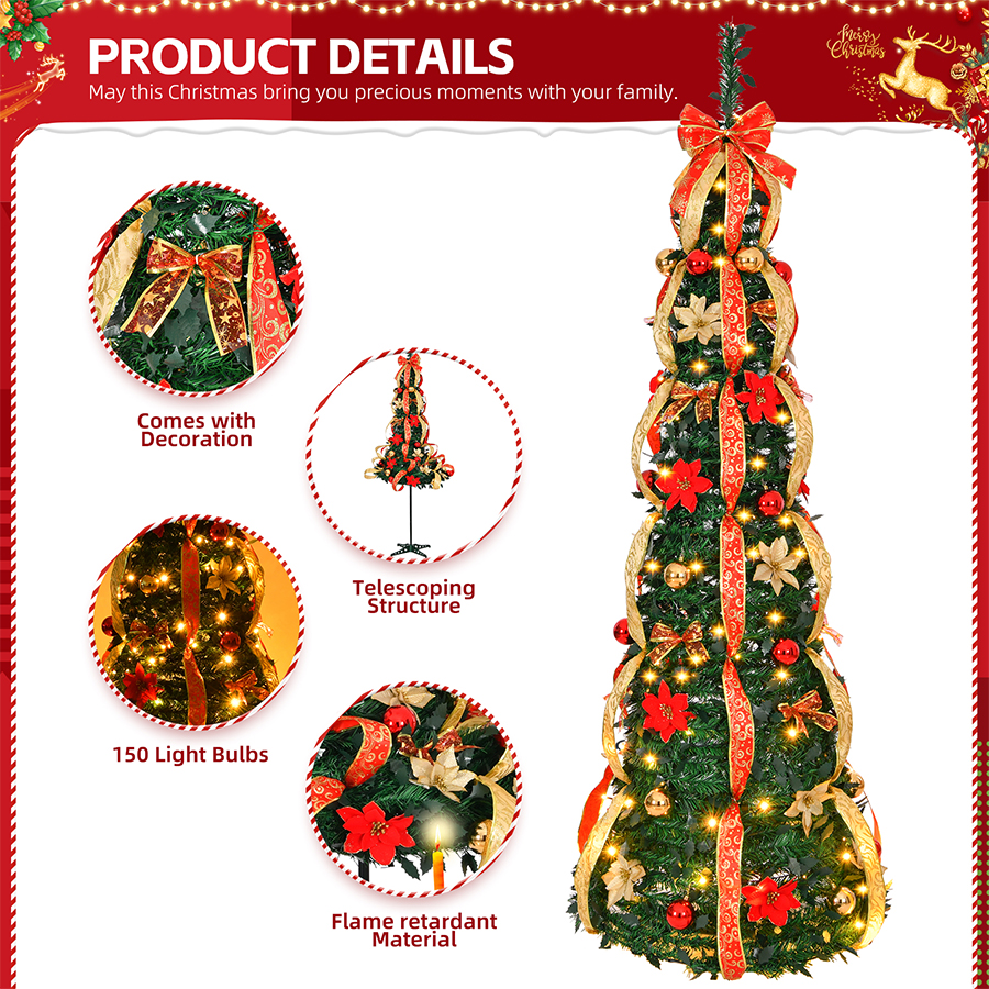 Constructed from high-quality flame-retardant PVC, the tree’s branches are durable and safe for long-term use. Its telescopic pop-up structure makes assembly effortless—just pull it up, secure it in place, and your Christmas tree stands tall and ready. After the holidays, the tree collapses easily into a compact size for simple storage, saving you time and space.