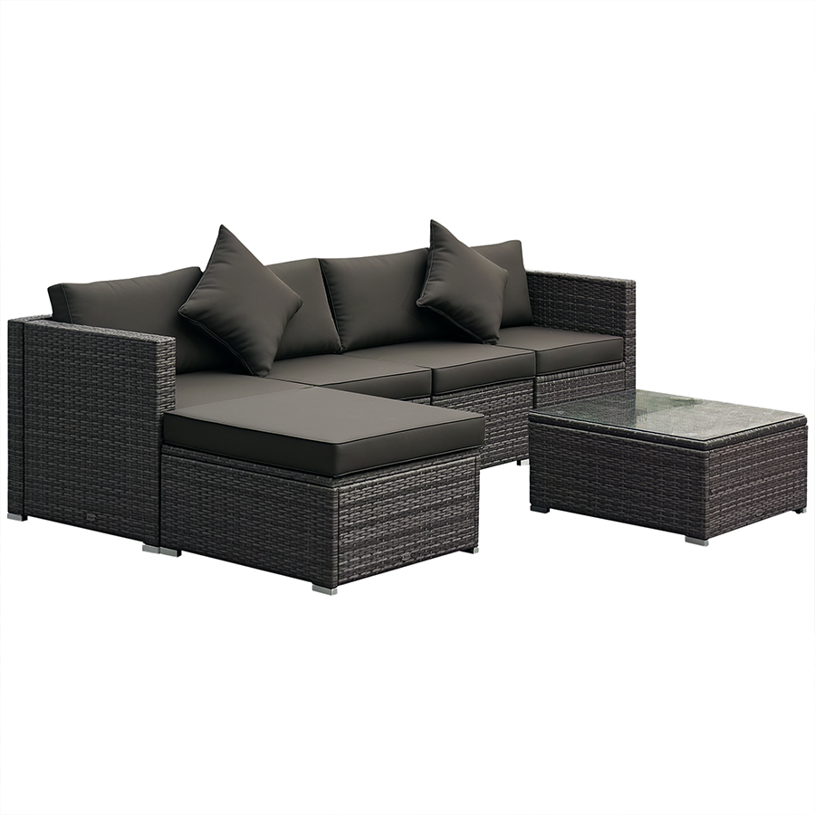 6-piece rattan patio furniture set with cushions, ottoman and glass table, ideal for backyard seating, outdoor lounging and patio entertaining.