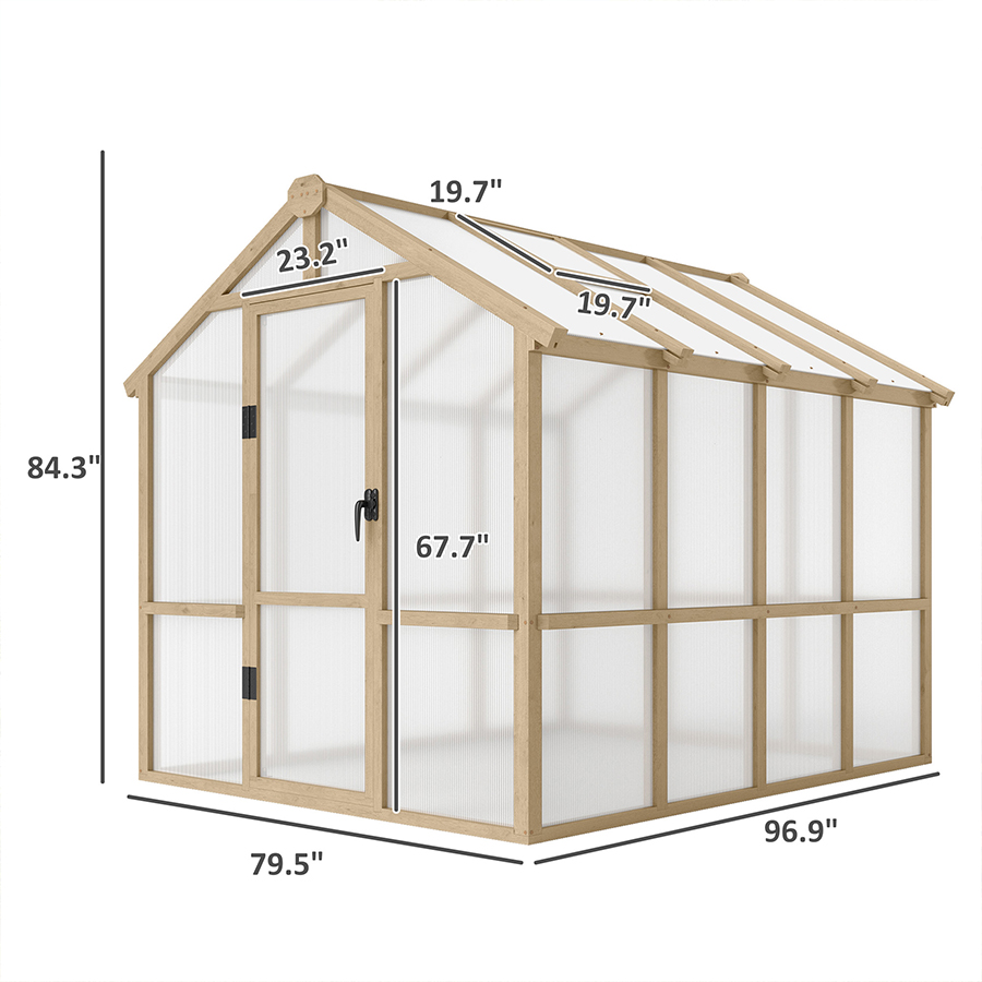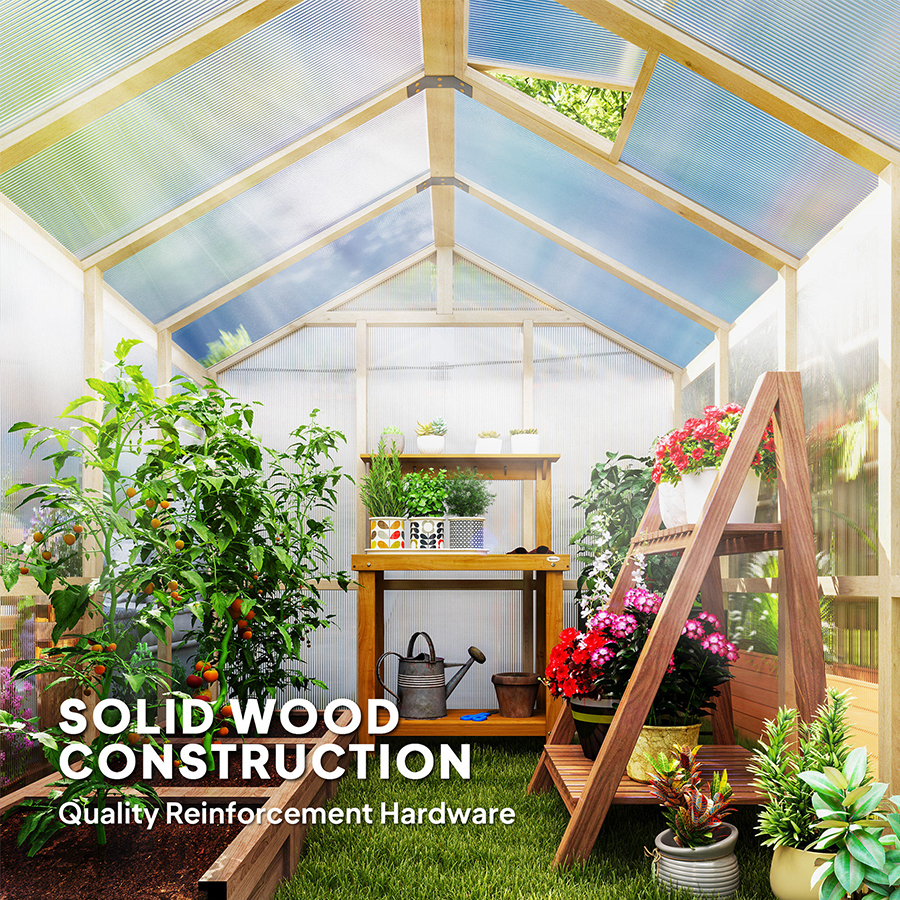 The natural fir wood frame delivers reliable structural strength while blending beautifully into garden landscapes. A lockable front door adds security for plants and gardening tools, while the top ventilation window allows you to easily adjust airflow, temperature, and humidity as seasonal conditions change. This thoughtful design helps prevent overheating and promotes stronger, healthier plants.